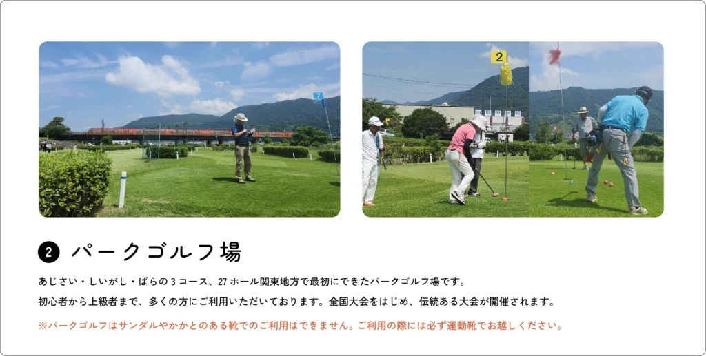 足柄上郡開成町の開成水辺スポーツ公園は、酒匂川のほとりに平成6年に誕生しました。関東で最初のコースが設けられたパークゴルフをはじめ、サッカー、野球、ソフトボールなど多目的に利用でき、いつも愛好者で賑わっています。また、季節ごとの美しい草花も楽しめる総合スポーツ公園です。 足柄上郡開成町の開成水辺スポーツ公園は、酒匂川のほとりに平成6年に誕生しました。関東で最初のコースが設けられたパークゴルフをはじめ、サッカー、野球、ソフトボールなど多目的に利用でき、いつも愛好者で賑わっています。また、季節ごとの美しい草花も楽しめる総合スポーツ公園です。 景観を大切に、プロフェッショナルな公園管理 私たちは、公園の美しさと機能性を最大限に引き出すプロフェッショナル集団です。長年の経験と専門知識を活かし、四季折々の景観を大切に守りながら、市民の皆様に愛される公園づくりに取り組んでいます。 公園管理センター 事務所では、施設利用申し込みの予約受付や用具の貸出しをいたしております。談話室は、飲食休憩スペースとしてご利用いただけます。 また、女性用トイレには、おむつ交換用の収納式ベビーベッドも設置しております。多目的トイレにオストメイト設置。 パークゴルフ場 あじさい・しいがし・ばらの3コース、27ホール関東地方で最初にできたパークゴルフ場です。初心者から上級者まで、多くの方にご利用いただいております。全国大会をはじめ、伝統ある大会が開催されます。 ※パークゴルフはサンダルやかかとのある靴でのご利用はできません。 ご利用の際には必ず運動靴でお越しください。 軟式野球場 右翼 95m 左翼 101m河川敷に設けられた軟式野球場は整備が良好で、地元の少年野球をはじめ、地域の人々に年間を通じて利用いただいております。 ※散水設備はございません。 少年野球場兼ソフトボール場 右翼 78m 左翼 69m水はけが良く雨の後でも良好な状態が維持され、多目的のグランドとして利用いただいております ※散水設備はございません。 サッカー場 90m×60m(白ライン)、68m×50m(赤ライン)芝生の育成のために専門家による通年の管理が行われ、良好な芝状態が維持されています。サッカーゴールは一般用、こども用を用意しております。 ※養生期間について:年2回の養生期間があります。養生期間中は、利用不可。 ピクニック広場 フリースペースになっております。グループ、ご家族で、周りの芝生でお弁当やおやつを広げ、楽しいひと時をお過ごしください。ツツジ、サツキをはじめ毎年花の種がこぼれ、四季折々の花が咲きます。 駐車場 お友達やご家族はもちろん、団体でのご利用もお待ちしております。普通車165台マイクロバス駐車可(大型バス駐車不可)電車高架下 高さ制限公道側 2.4M公園側 3.5M シャワールーム 100円 備品倉庫 公園を訪れる皆様に快適な時間を提供するため、縁の下の力持ちとして活躍しているのがメンテナンス機械です。公園の魅力と機能性を支える重要な役割があります。 所在地 〒258-0021 神奈川県足柄上郡開成町吉田島2710 TEL/FAX TEL:0465-83-1331 / FAX:0465-83-1332 入園料 無料(※一部有料施設あり。詳細は各施設の情報をご確認ください) 駐車場 無料 開園時間 8:30~17:00 運営 開成スポーツパートナーズ湘南造園株式会社(代表企業)NPO法人湘南ベルマーレスポーツクラブ(構成員) 電車でお越しの場合 小田急小田原線「新松田駅」より 小田急小田原線新松田駅北口の改札を出たら左手に進み、ロマンス通り商店街を直進します。最初の信号を酒匂川方面へ左折します。松田郵便局を右手に見ながら直進し、十文字橋を渡ると橋の上から対岸左手に当公園のパークゴルフ場が見えてきます。 お車でお越しの場合 東名高速道路「大井松田I.C.」より 大井松田I.C.を出たら開成・南足柄方面へ、河原立体交差でJR御殿場線をくぐり「南足柄・開成」方面へ直進します。足柄大橋で酒匂川を渡ります。「吉田島」信号を右折したら、二つ目の信号を右折します。800mほど先にある「開成スポーツ公園」の看板を右折します。 開成水辺スポーツ公園の利用ルールを守って、楽しいひと時をお過ごしください。 ・開成水辺スポーツ公園の施設をきれいに使いましょう。・集団での活動や運動をする場合は、必ず有料施設を利用してください。・公園内の動物や植物を大切にしましょう。・立ち入り禁止区域は危険なので入らないでください。・指定された場所以外に車両を乗り入れることはやめましょう。・ごみは持ち帰りましょう。・花火、バーベキューなど火気の使用は禁止です。・テントの設置・キャンプは禁止です。・広告等宣伝行為は禁止です。・直売店以外での物品の販売等営業行為は許可が必要です。・他の利用者に危険や迷惑を及ぼす行為(犬の放し飼いなど)は禁止です。 利用規約